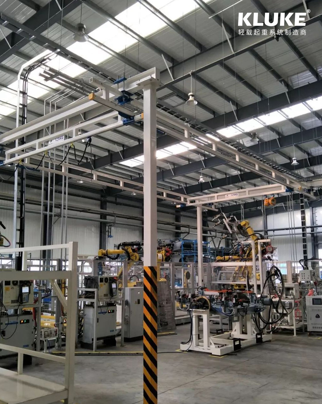 KLUKE解決方案:額定載荷125kg的軌道式自立起重機,配套6根主梁及環(huán)鏈電動葫蘆、彈簧平衡器。