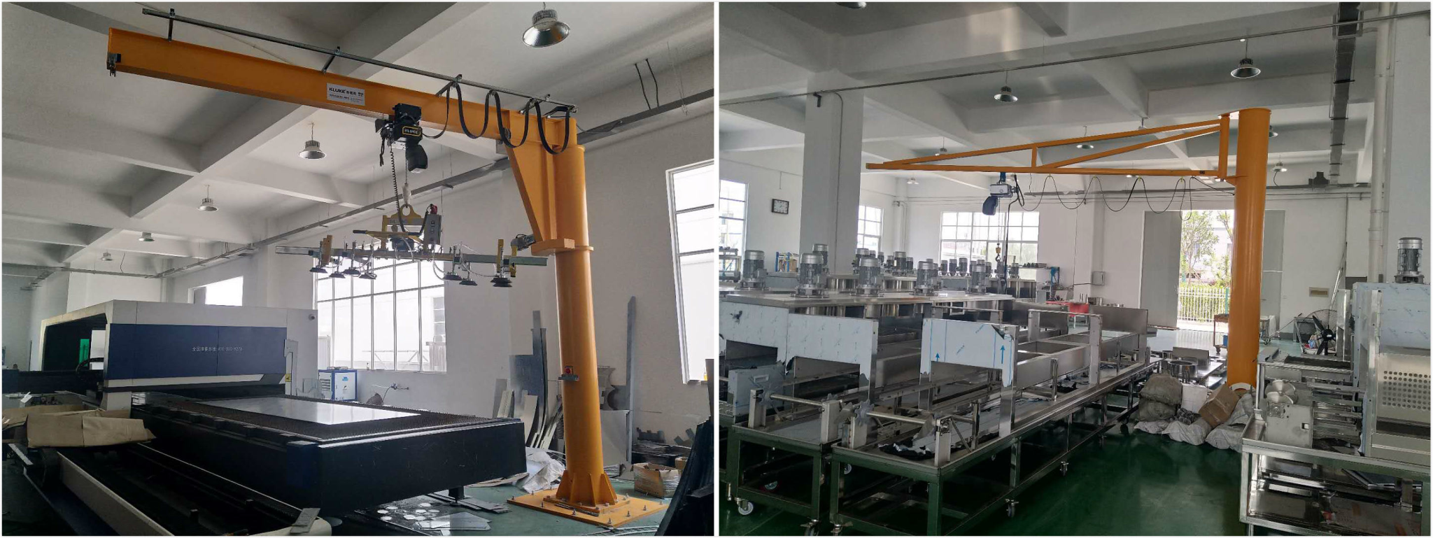 KLUKE解決方案:克魯克軌道式旋臂起重機(自立),工字鋼旋臂起重機(自立)各一臺,分別配環(huán)鏈電動葫蘆+定制吸盤——