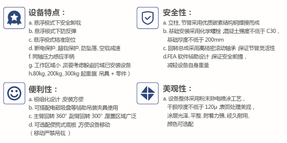1、旋轉(zhuǎn)方式為手動(dòng)2、石墨銅套回轉(zhuǎn)結(jié)構(gòu)設(shè)計(jì),自潤(rùn)滑使摩擦阻力小,操作輕便,免維護(hù)。3、標(biāo)配進(jìn)口化學(xué)螺栓,充分確保您的使用安全。4、旋轉(zhuǎn)限位在安裝時(shí)根據(jù)現(xiàn)場(chǎng)需求進(jìn)行固定。5、回轉(zhuǎn)驅(qū)動(dòng)經(jīng)獨(dú)特調(diào)質(zhì)熱處理,強(qiáng)度高的同時(shí),經(jīng)久耐用。6、定制工裝固定生產(chǎn),確保水平與平行角度控。7、各部件標(biāo)配二次保護(hù)裝置,給您的使用提供雙重安全保障。8、根據(jù)工藝需要,獨(dú)立安裝于車(chē)間地面,地基要求僅為混凝土C30,厚度≥200mm。9、粉末靜電噴涂工藝,干膜厚度不低于120μ,表面處理美觀,光澤、平整、附著力強(qiáng)、經(jīng)久耐用。